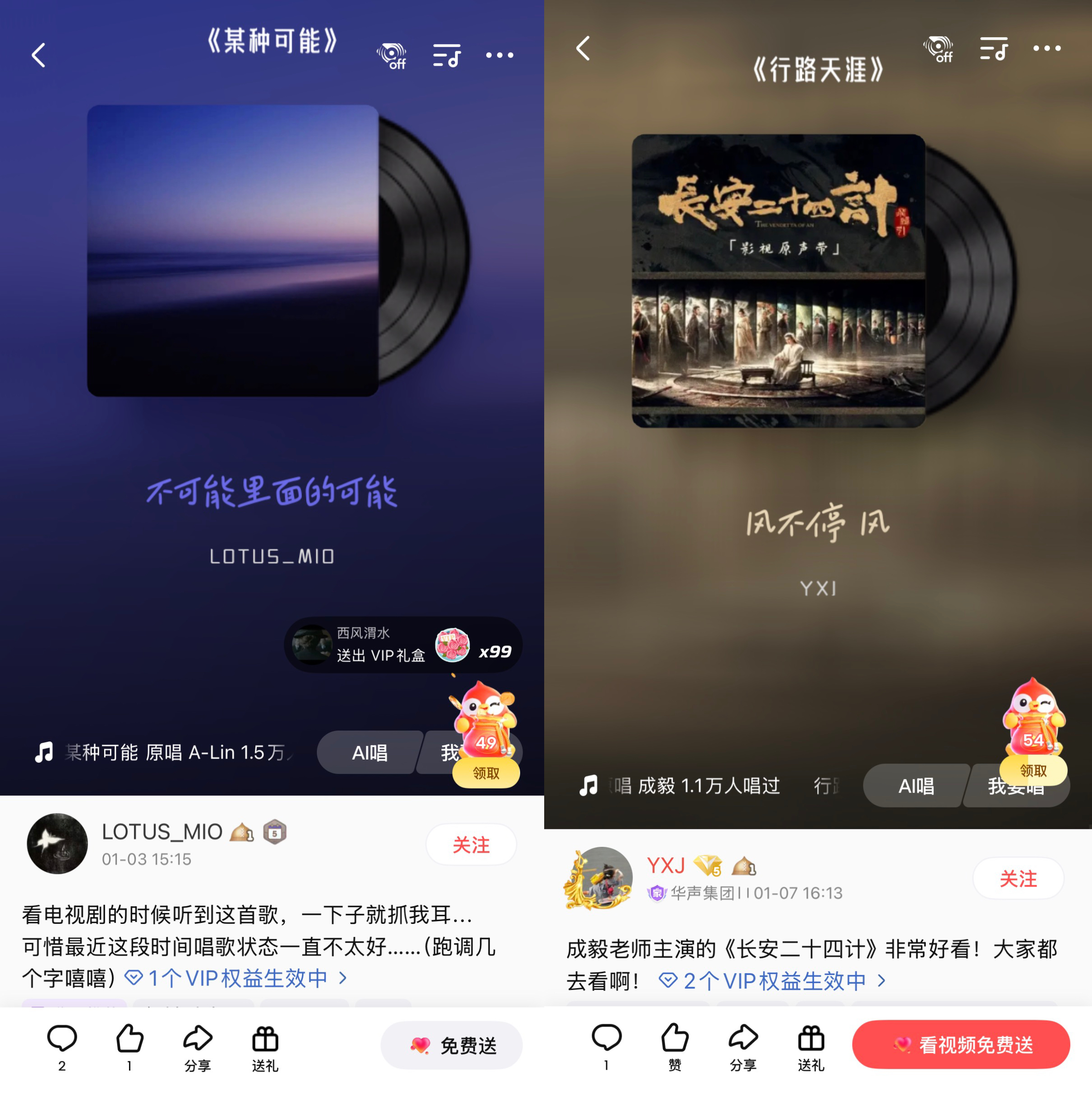 除了《骄阳似我》OST在全民K歌掀起翻唱热潮,也有许多热播剧的OST成为了大家翻唱的选择。如K歌网友“LOTUS_MIO”翻唱了《狙击蝴蝶》的主题曲《某种可能》,在“VIP伴奏”下将剧中细腻的情愫演绎得丝丝入扣;K歌网友“YXJ”翻唱了《长安二十四计》的人物主题曲《行路天涯》,“VIP音效”、“VIP伴奏”的加持下唱出了剧中角色仗剑江湖的豪迈与洒脱。