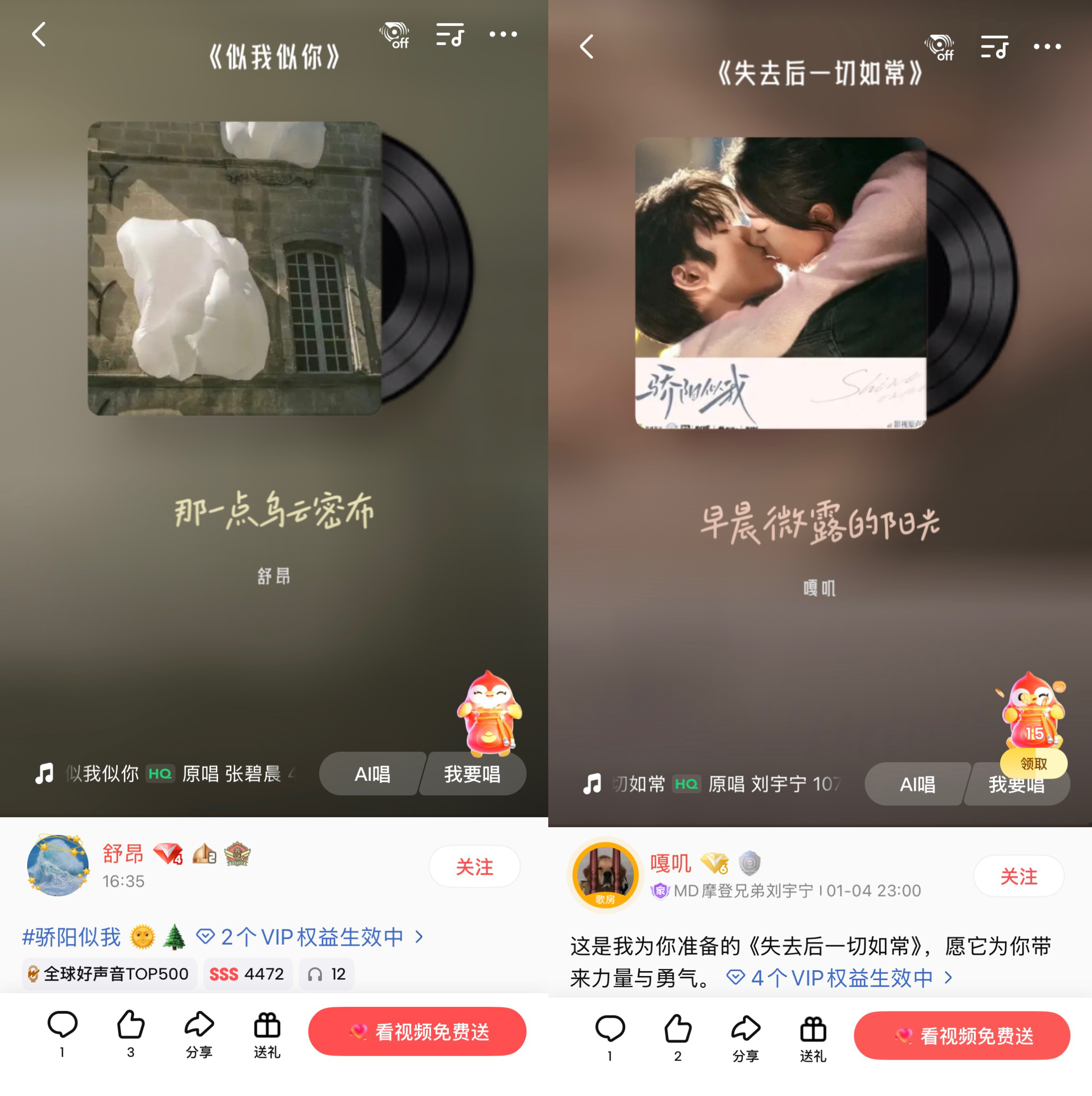 《骄阳似我》影视原声带极具诚意,集结了张碧晨、刘宇宁、孙燕姿等实力唱将与金牌制作团队,精准贴合剧集“双向奔赴、彼此照亮”的治愈内核。为观众打造了一场沉浸式听觉盛宴。主题曲《似我似你》由张碧晨演唱,穿透力极强的声线搭配细腻旋律,复刻了聂曦光与林屿森从误会破冰到并肩相守的情感轨迹;刘宇宁献唱的《失去后一切如常》则以深沉嗓音诠释成长路上的遗憾与释然;孙燕姿重唱经典《遇见》更满是青春回忆杀,将聂曦光校园时期的青涩暗恋娓娓道来。随着《骄阳似我》剧集的热播,观众在沉浸式追剧之余也来全民K歌翻唱相关歌曲,用歌声续写这份羁绊。例如K歌网友“舒昂”在“VIP音质”、“人声增强”辅助下翻唱主题曲《似我似你》,清亮嗓音完美唱出剧中的治愈氛围感;K歌网友“嘎叽”翻唱了《失去后一切如常》,“人声增强”、“录唱皮肤”、“VIP伴奏”、“VIP音质”功能赋能下令原曲内涵得到充分升华,将歌曲里的成长遗憾与释然感拉满。