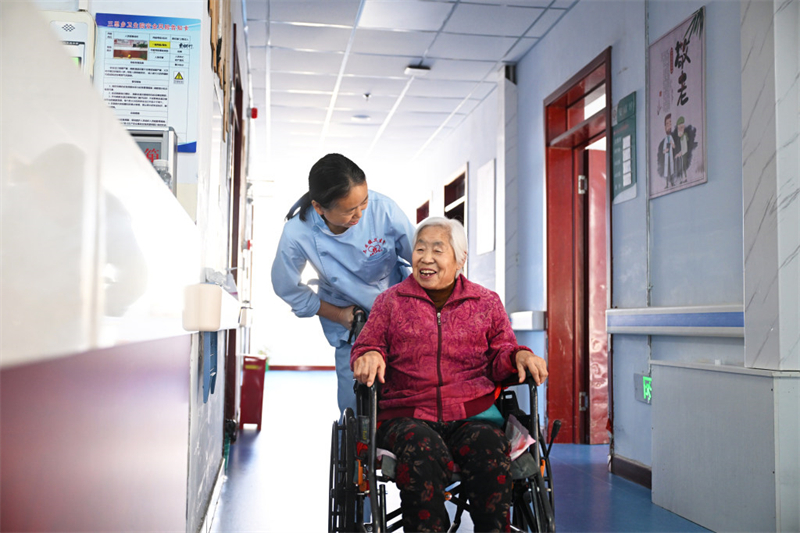 1月11日,在邢台市南和区三思镇卫生院医养中心,养老照护员推失能老人去做康复训练。