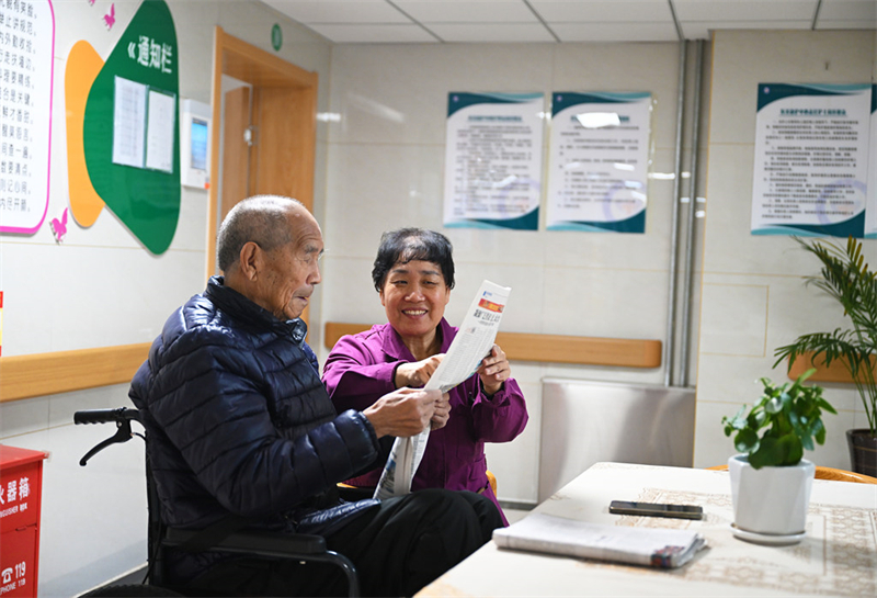 1月11日,在邢台市南和区人民医院医养中心,养老照护员陪失能老人读报。