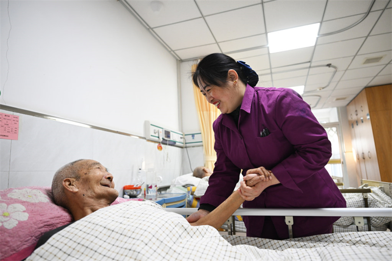 1月11日,在邢台市南和区人民医院医养中心,养老照护员陪失能老人聊天。