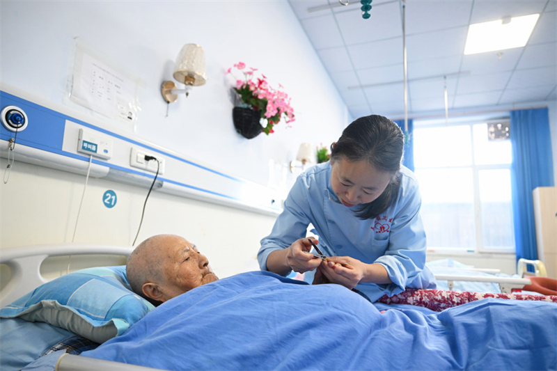 1月11日,在邢台市南和区三思镇卫生院医养中心,养老照护员为失能老人剪指甲。