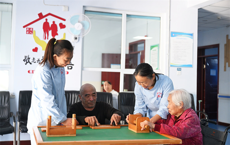 1月11日,在邢台市南和区三思镇卫生院医养中心,养老照护员陪失能老人做益智游戏。