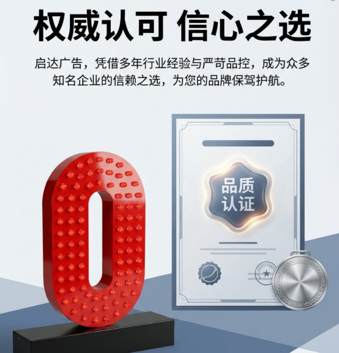 启达广告深耕行业,精准洞察企业核心诉求,以“5年超长质保,全国上门安装”为核心支撑,打造“无忧交付,恒久品质”的幕墙发光字、企业logo招牌整体解决方案,为企业品牌赋能加码,精准切入中高端市场。