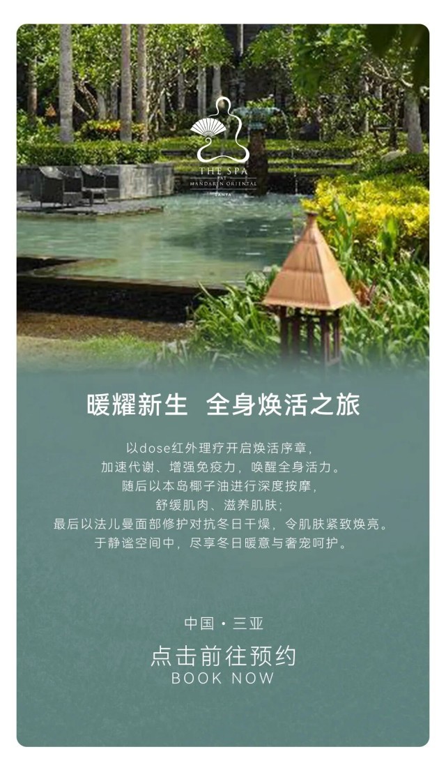 据悉,现正式于“深圳文华东方酒店”、“上海浦东文华东方酒店”、“三亚珊瑚湾文华东方酒店”“广州文华东方酒店”四地同时上线dose红外线SPA身心疗愈项目,体验已开放接受预约,可在酒店官网或公众号了解详情,点击原文即可即可通过文华东方酒店官方商城购买预约体验。