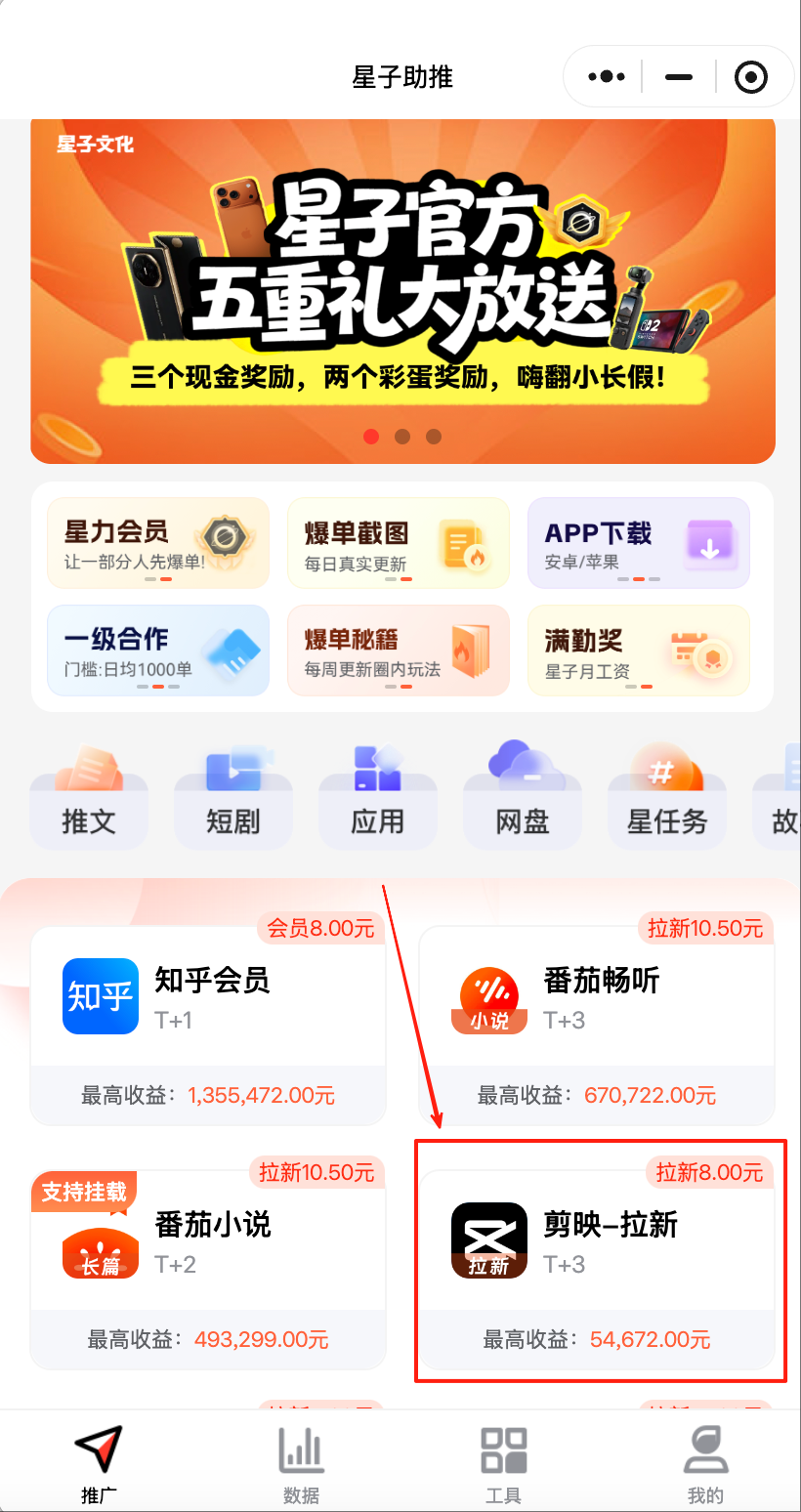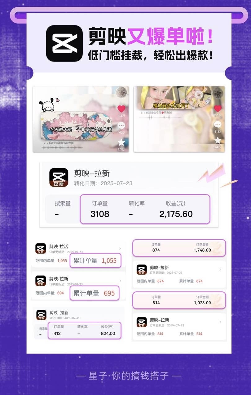 作为剪映官方认证的合作推广平台,星子助推围绕剪映拉新打造了 “数据透明、资源配套、服务保障” 的三位一体支持体系,为推广者扫清障碍: