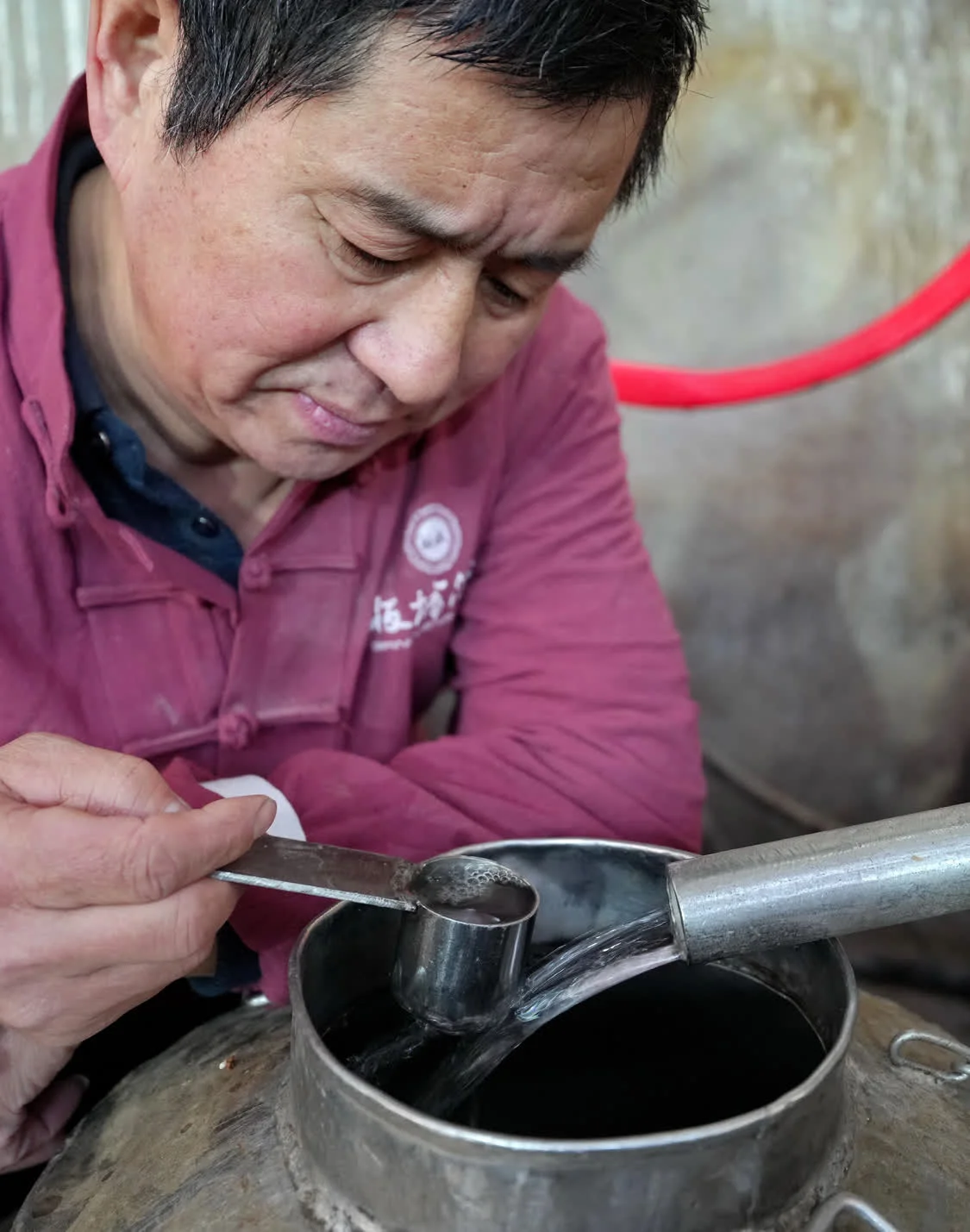 1月28日,河北省承德县承德乾隆醉酒业有限责任公司的工人在酿酒车间查看新酿酒的酒花。新华社记者 杨世尧 摄