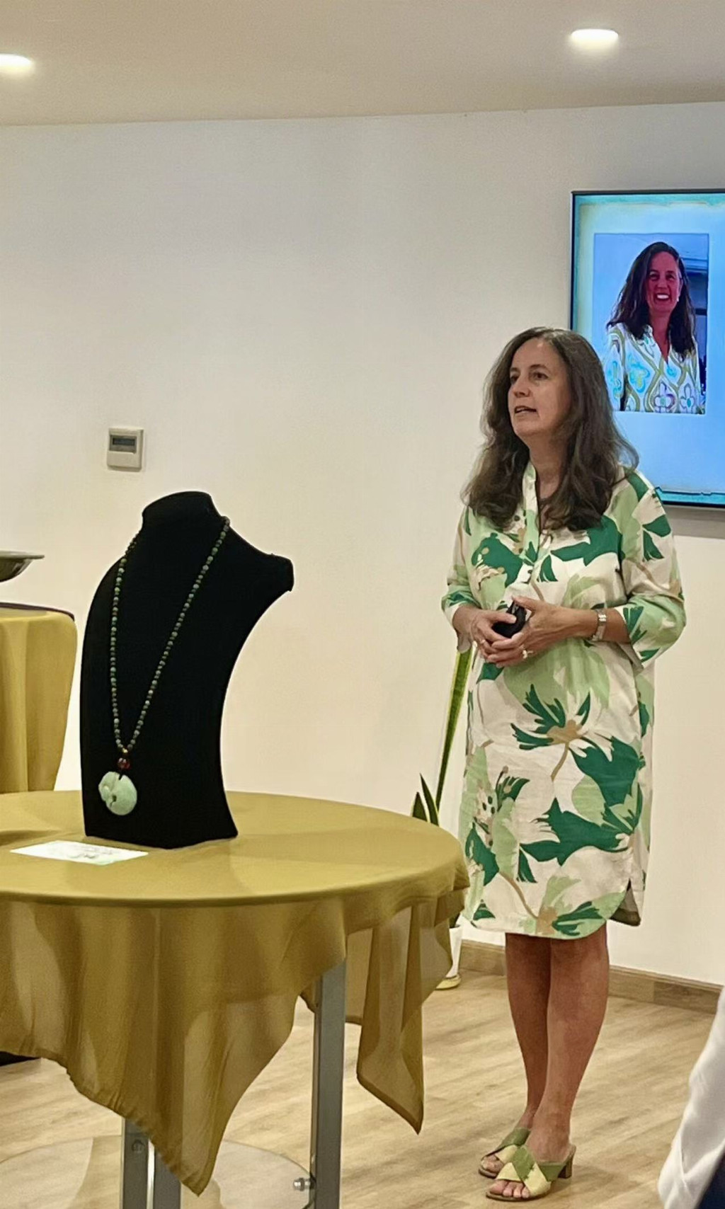 本次展览由德国中华瑰宝协会主办,并荣幸邀请到德国驻阿拉伯联合酋长国总领事兼大使夫人 Mrs. Sybille Pfaff 出席并致辞。她特意身着绿色礼服呼应展览主题,在致辞中阐述了三点重要见解:其一,她本人对绿色怀有独特偏爱;其二,她指出中东地区曾在古代陆上丝绸之路上扮演重要贸易通道的角色,因此本次以“翠色”为主题的展览在此举办尤为贴切;其三,她高度认同跨越国界与民族的文化交流活动,对跨文化对话充满支持。