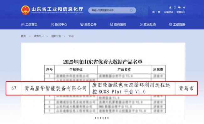 近日,山东省工业和信息化厅发布2025年山东省大数据产业“三优两重”项目名单。双星旗下青岛星华智能装备有限公司“废旧轮胎绿色生态循环利用远程运控RCOS Plat平台V1.0”(简称“RCOS Plat 平台”),凭借领先的智能化设计与技术创新性,成功入选优秀大数据产品名单。这一荣誉不仅彰显了双星在工业大数据应用领域的硬核技术实力与创新成果,更为行业数字化转型提供了可复制、可推广的实践样本。