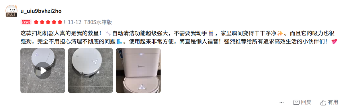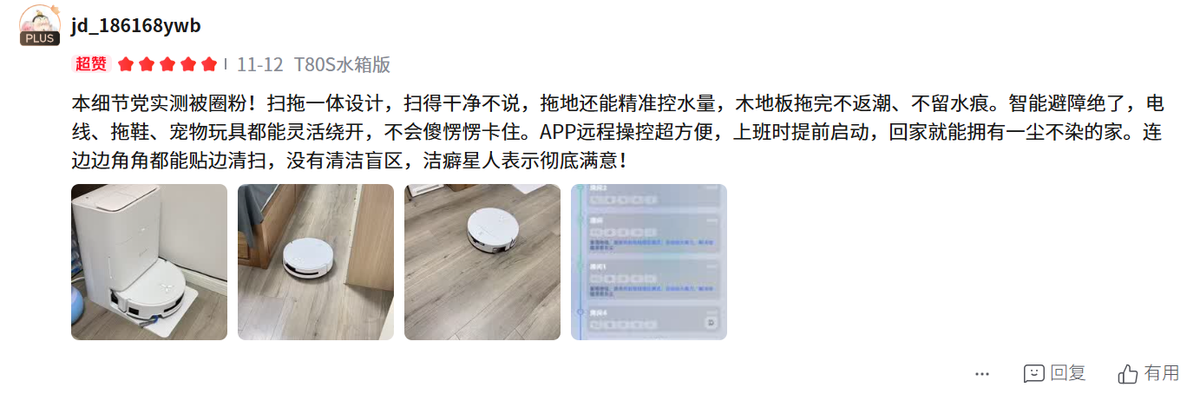 广泛用户好评:T80s在消费者中口碑极佳,用户普遍认为其清洁功能强大,极大提升了全屋清洁覆盖率。