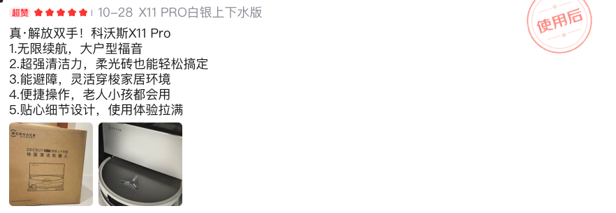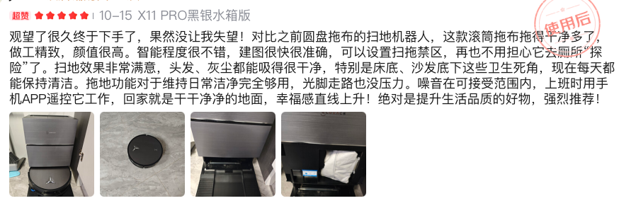 用户口碑极佳:凭借“1000㎡”级别的覆盖能力,瞬时超充无限续航能力等,科沃斯地宝X11在用户群体中拥有极高的满意度。