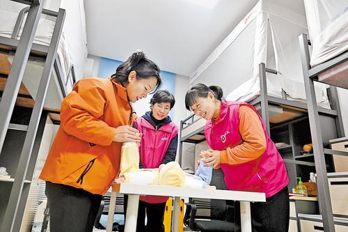 1月19日,来自衡水市的“河北福嫂”张培培(右)在北京市东城区福嫂之家学习育儿技能。