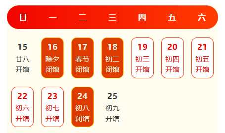 春节将至,为更好满足观众的参观需求,河北省科技馆2026年春节期间开放时间安排如下:2026年2月16日(除夕)至2月18日(正月初二)闭馆,2月19日(正月初三)起正常开馆,2月24日(初八)闭馆一天。