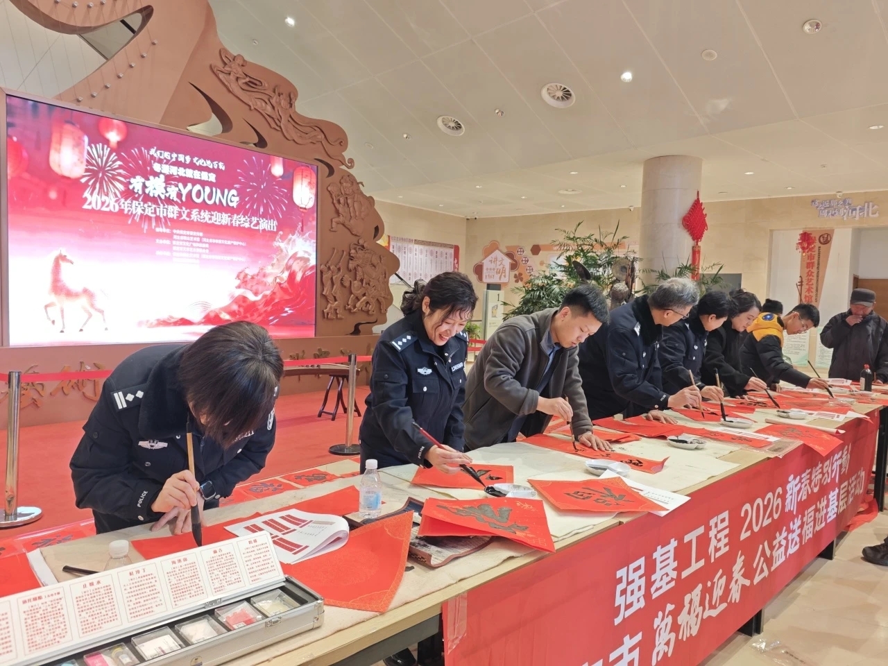 墨香萦绕、暖意融融,广大青少年书画爱好者现场创作了一幅幅饱含新春祝福的春联和书画作品。其中,禁毒主题春联备受关注,由保定市书法名家、青少年学生代表与戒毒民警共同创作的楹联作品,将禁毒警示融入传统格律,对仗工整、寓意深刻,让大家在赏春联、品年俗的过程中,潜移默化学习禁戒毒法律法规。