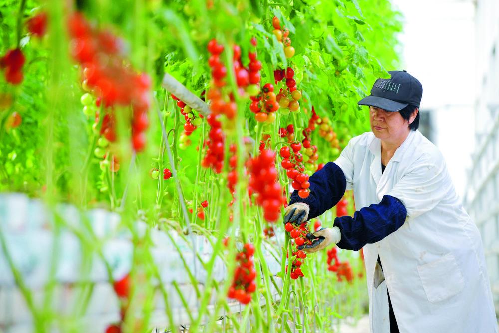 在塔元庄智慧农场,工作人员正在采摘西红杮。