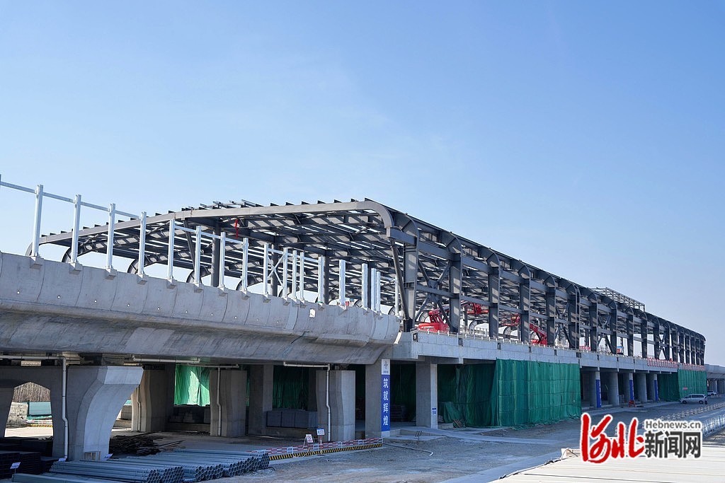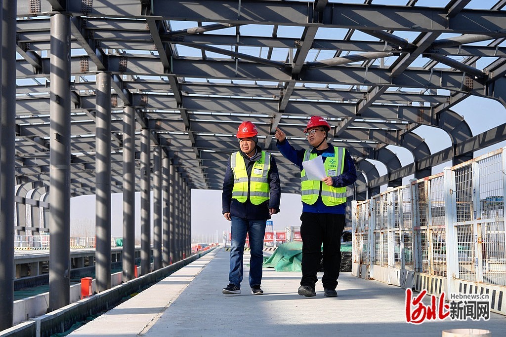 2月12日,北京地铁22号线河北段齐心庄站施工现场,工作人员在检查钢结构屋面。