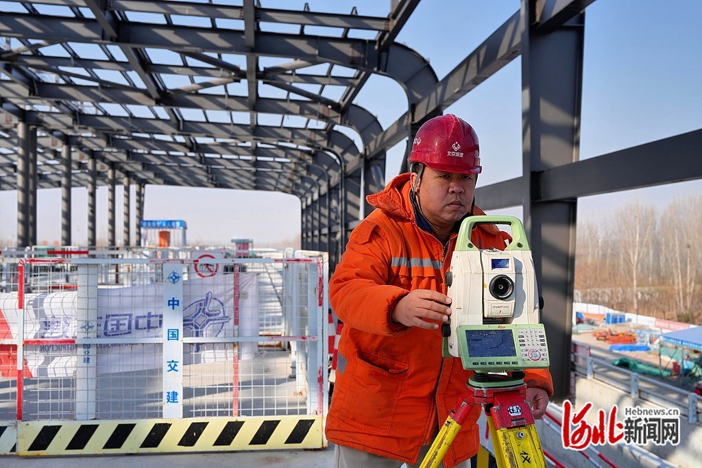 2月12日,北京地铁22号线河北段齐心庄站施工现场,工作人员在进行测量工作。