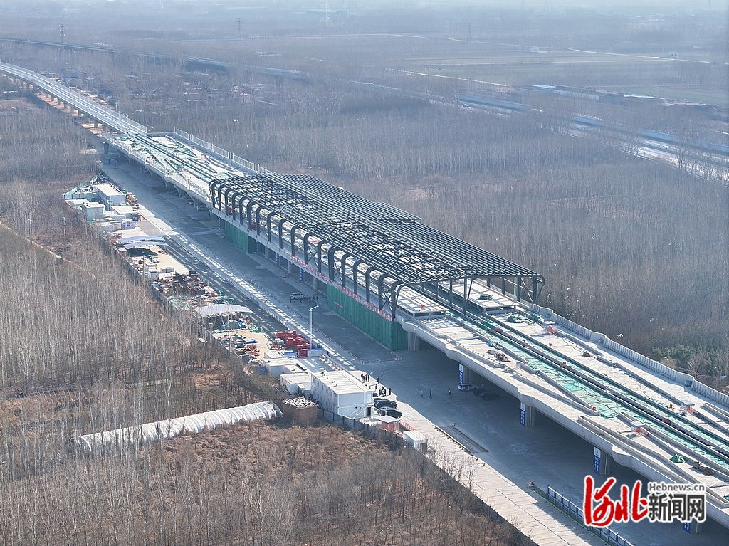 2月12日,无人机航拍的北京地铁22号线河北段齐心庄站施工现场。
