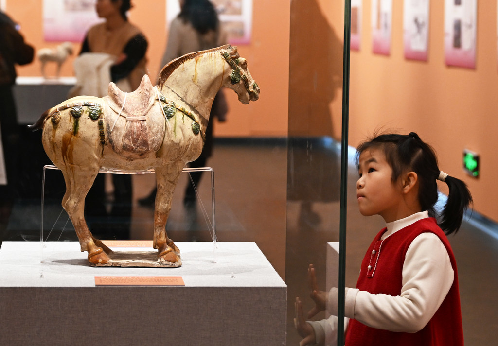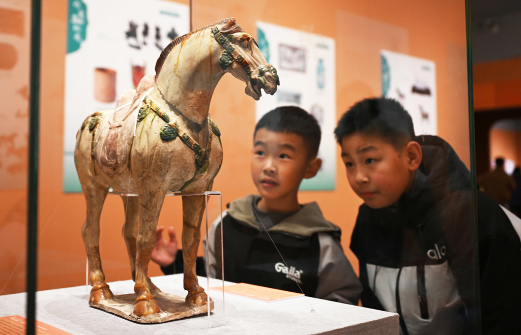 2月17日,小游客在河北博物院观看院藏文物巩县窑三彩马。