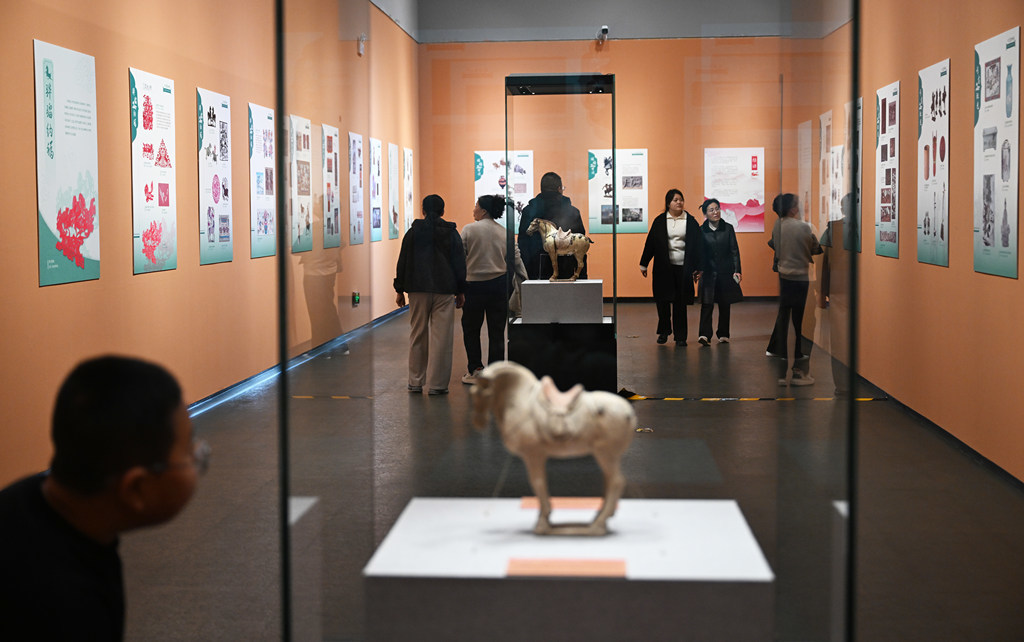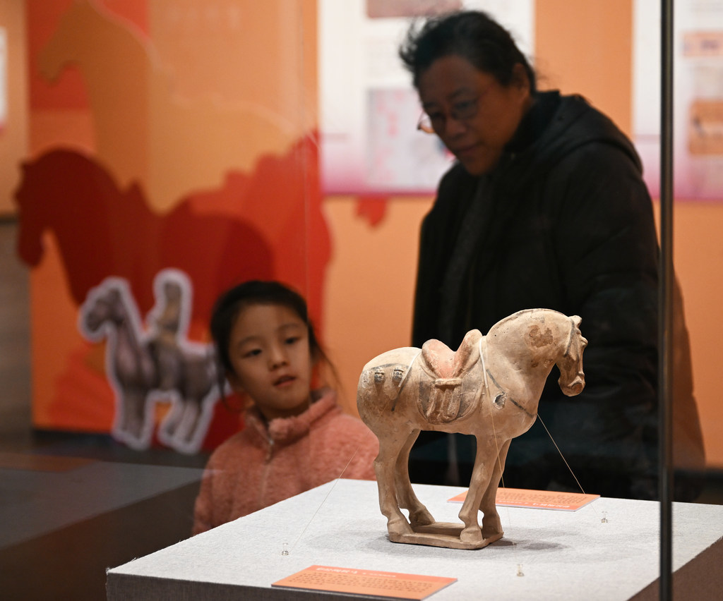 2月17日,游客在河北博物院观看院藏文物彩绘陶鞍马。