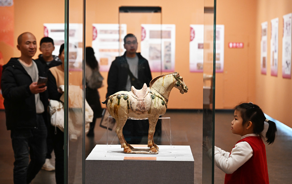 2月17日,游客在河北博物院观看院藏文物巩县窑三彩马。