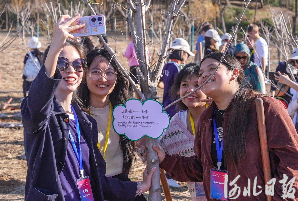2025年3月20日,中美学生在“中美友谊传承青年林”种下友谊之树并自拍留念。 河北日报记者 李东宇摄