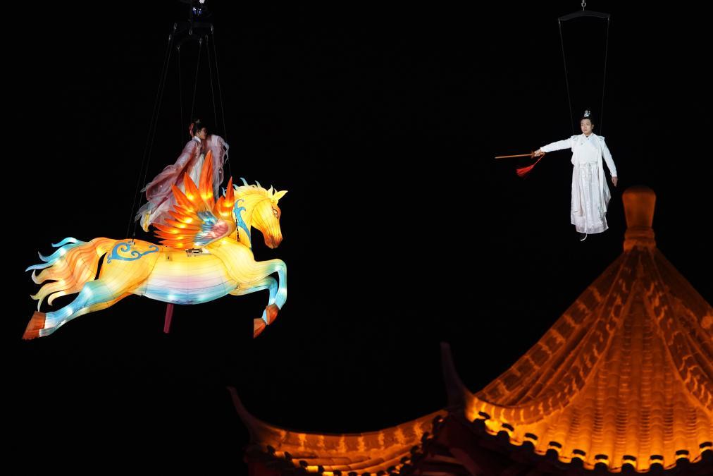 正月初三,夜幕低垂,华灯初上。在河北省邢台市好南关,随着音乐声奏响,金色“天马”和两名演员腾空而起,大型实景演艺《古街甜缘·周公斗桃花》震撼上演,点燃了这座城市的马年新春氛围。