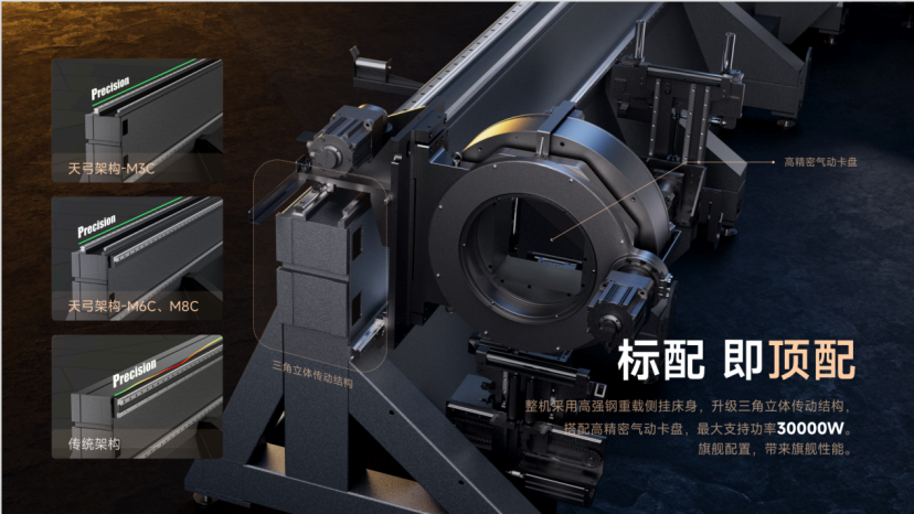 1、高强钢重载侧挂床身:提供无与伦比的结构刚性与抗振性,最大支持功率30000W;