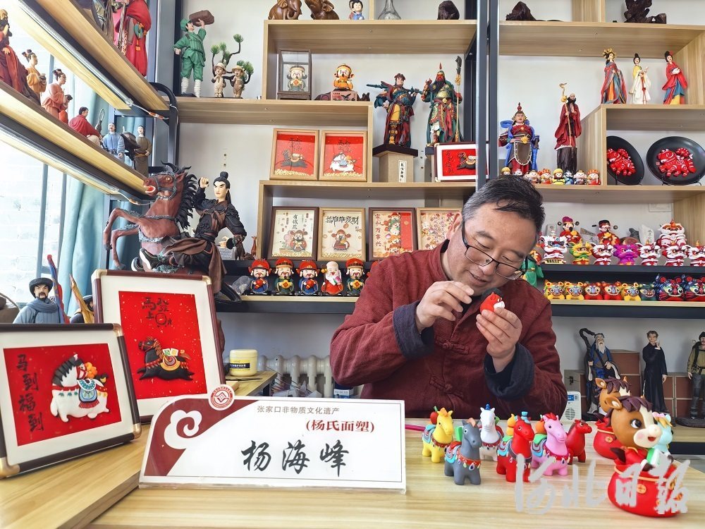 为了迎接新春,杨海峰精心设计了20余款主题面塑,从构思绘图到动手制作,反复打磨细节,将传统技法与时尚元素相融,让老手艺更“潮”。热闹的工作室里,游客们或挑选面塑或围观创作、或请教技法,满是新春的喜庆与热闹。“我不仅要把新春祝福捏进面团,还捏了一组张库大道盛景,把家乡的故事讲给更多人。”杨海峰说。