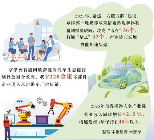 京津冀联合绘制氢能、生物医药、网络安全和工业互联网、高端仪器设备和工业母机、新能源和智能网联汽车、机器人6条重点产业链图谱,梯次建设集成电路、网络安全、生物医药、电力装备、安全应急装备5个产业集群,“六链五群”产业协同发展的画卷徐徐展开。