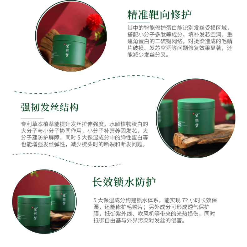 黛熙梦臻萃修护发膜的修护实力源于其精心搭配的多效成分体系,每一种成分都精准对应发丝痛点,协同作用实现全方位修护:含有水解植物蛋白(ZL202310347072.2 )、水解角蛋白、角蛋白,三种蛋白成分协同作用,能精准填补毛鳞片缝隙,修复受损毛鳞片结构,补充发丝流失的营养,增强发丝韧性,减少断发分叉;添加九重精油(澳洲坚果籽油、伯尔硬胡桃籽油、欧洲越桔籽油、油橄榄果油、白池花籽油、向日葵籽油、北非雪松树皮油、西伯利亚冷杉油、山茶籽油),多重植物精油可快速渗透发丝,补充发丝所需脂质,抚平毛鳞片粗糙,缓解干枯紧绷感,同时在发丝表面形成透气防护膜,减少水分流失;搭配小分子多肽,进一步强韧发根、稳固发丝,减少掉发断发;含有专利草本植萃ZL201910367260.5(刺五加、石榴皮多芬、生姜醇、天竺葵),温和舒缓头皮,改善头皮敏感、干燥瘙痒的问题,同时调节发丝滋养平衡,避免滋养过度导致的发根黏腻;添加五大保湿成分(sod滋养因子、甘露糖醇、海藻糖、弹性蛋白、甘油),层层锁水、深层补水,从根源改善发丝干枯,长效维持水润状态;还有泛醇辅助修护受损发丝,提升发丝柔顺度,让受损发丝逐步恢复强韧有弹性。