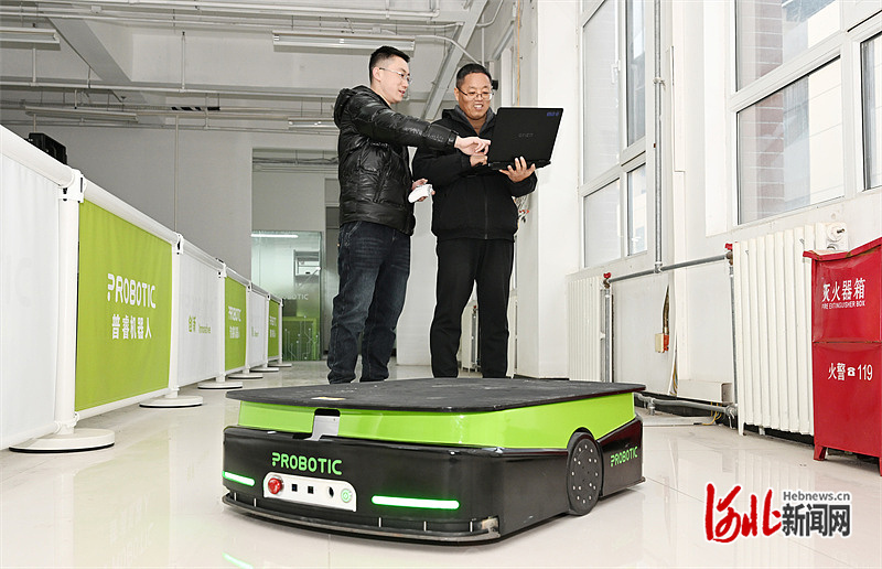 2月6日,普睿机器人(河北)有限公司研发人员在调试AMR(自主移动搬运机器人)。河北日报记者 史晟全摄