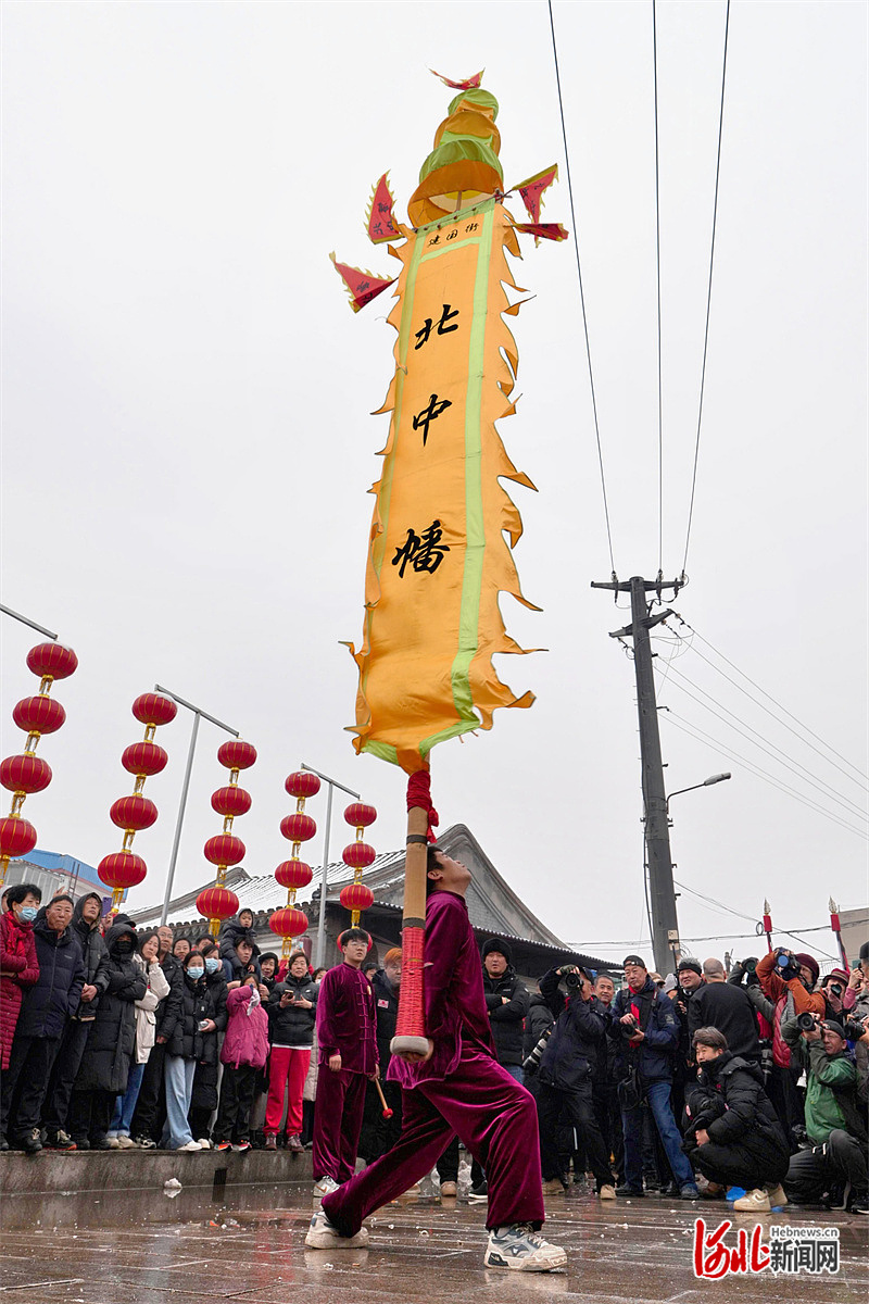 3月3日,霸州市胜芳古镇花会活动现场,胜芳北中幡会的演员正在表演。河北日报记者 王伟摄