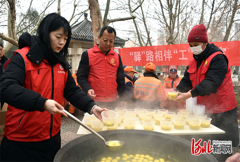“吃元宵喽!”来自定州市总工会的工作人员从大锅里盛出元宵,热气裹着糯米香向四下漫开。刚结束清扫工作的环卫工人高杏枝边吃边说:“黑芝麻馅的,甜!”