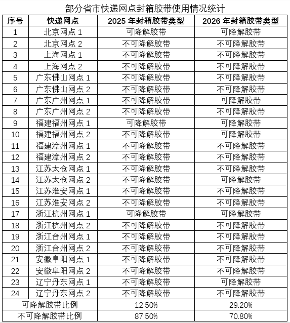 随着2026年1月 “禁塑令”正式生效后,这一状况出现了改善的迹象。调研样本结果显示,在广东、福建、浙江、江苏等快递业务量密集的沿海地区,已有快递网点主动启动可降解胶带等环保替代方案。