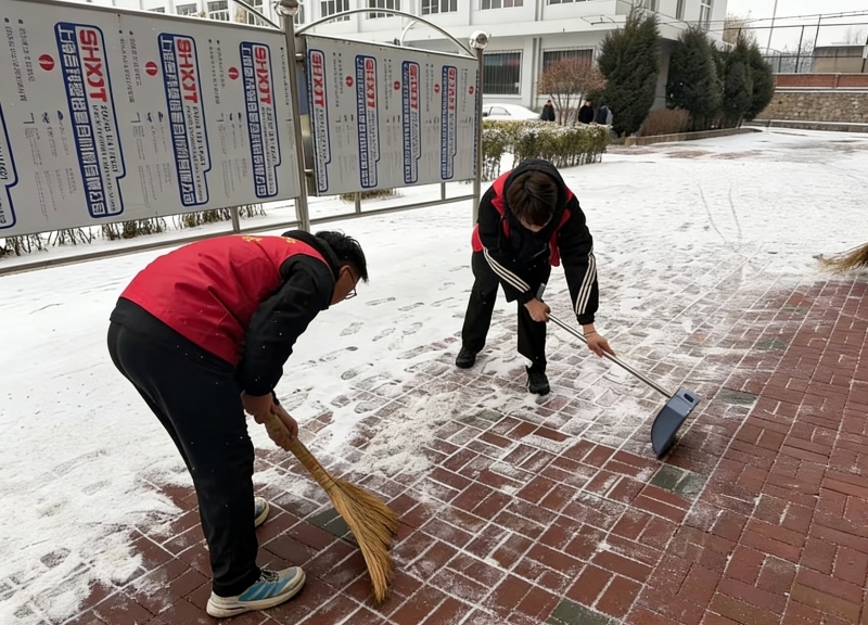 清晨的校园寒意未消,志愿者们已携带清扫工具,在校园主干道、教学楼出入口等重点区域,有序开展清雪除冰行动。活动中,大家分工明确、协作默契,经过近一个小时的奋战,校园主干道及重点区域的积雪、冰层被全面清理干净,有效消除出行安全隐患。