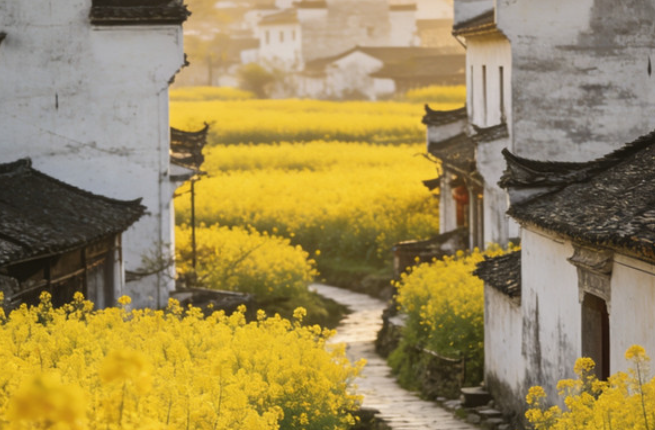 以油菜花闻名,和徽州风格接近,但更偏自然田园。春天连片花海很震撼。