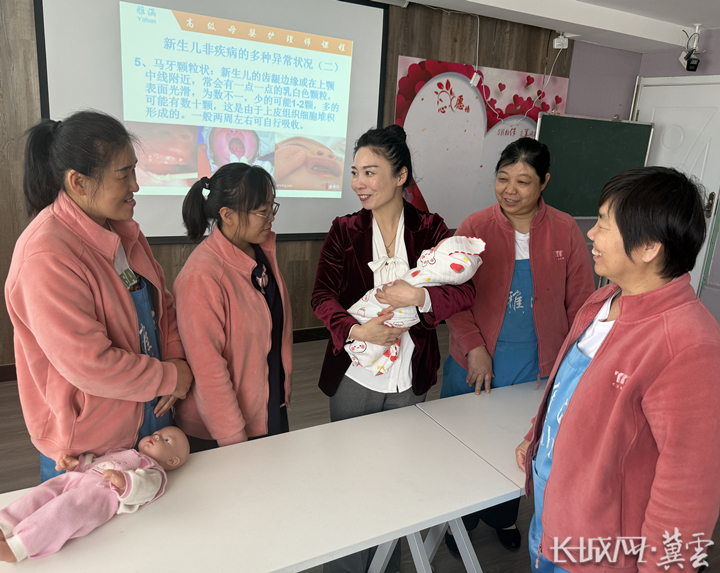 张青(左三)为月嫂讲解照顾婴儿的注意事项。