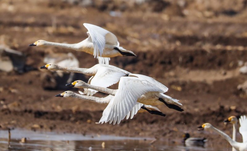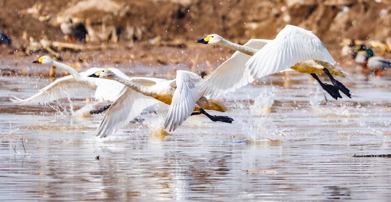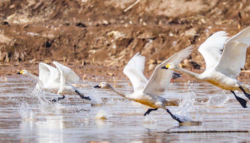 3月22日,天鹅在怀安县洋河湿地起飞。