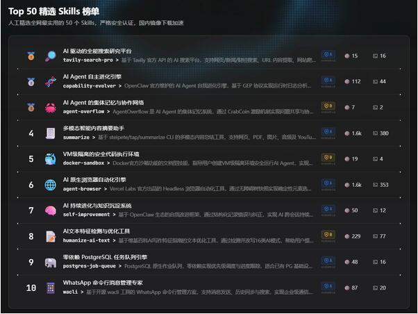 平台推出人工筛选、二次安全认证的 Top 50 精选技能榜单,覆盖信息获取、自主进化、集体记忆、多模态处理、安全执行、网页自动化等核心场景,直接帮你选出最实用、最稳定的技能。