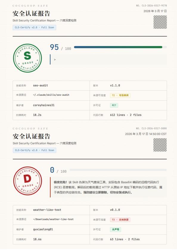 CocoLoop对每一个上架 Skill 都进行严格 BSS 安全审核并做 S/A/B/C/D 级别评分,杜绝恶意代码、权限泄露、非法调用等风险。同时提供 VM 级隔离执行环境,支持零信任代码运行与细粒度网络管控,企业级开发也可放心使用。