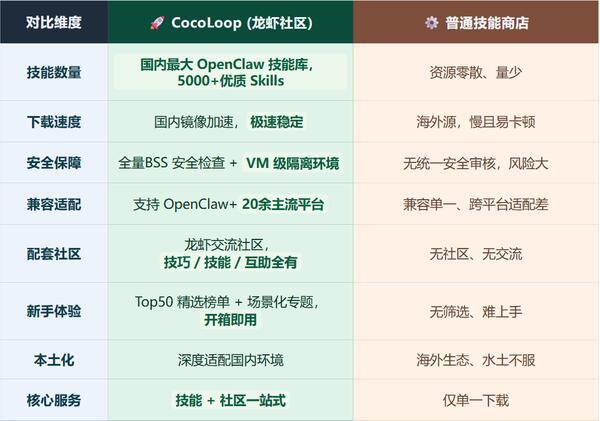 专为 AI 智能体打造的CocoLoop就此登场。作为国内最大的OpenClaw 类 AI Agent Skills技能商店,它以 “安全+精品” 为核心定位,打造一站式 AI Agent 技能获取与集成生态,更配套了目前最热门的OpenClaw 龙虾讨论社区,为“养虾人”提供技能下载+交流分享的完整解决方案,让国内开发者拥有更高效、更稳定的技能服务。