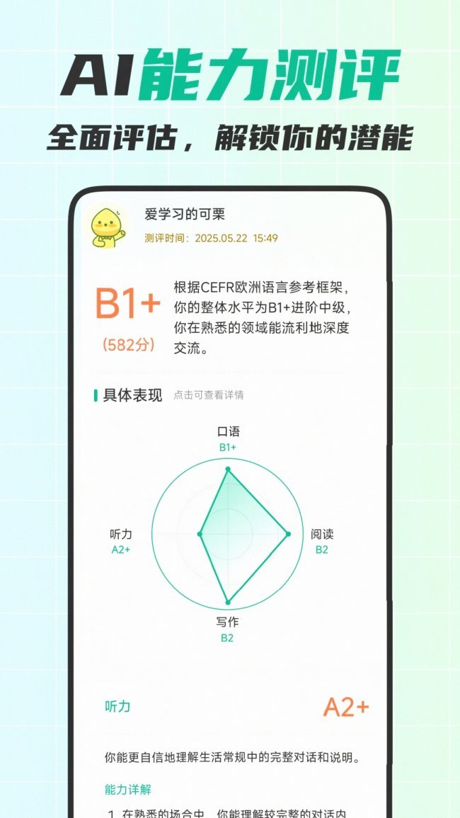 优先选门槛低、无压力的工具,零基础最容易卡壳在「不敢开口」的阶段,可栗口语支持语速调节、中英双语切换,说错了AI会耐心纠正,不会有尴尬感,还有从A0到C2的完整学习路径,非常适合零基础入门。