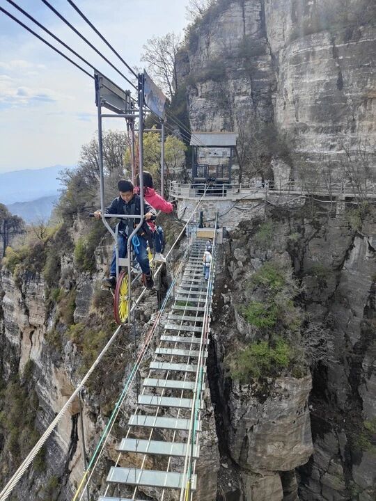 游客在河北省涞源县白石山景区体验空中自行车。王昆 摄