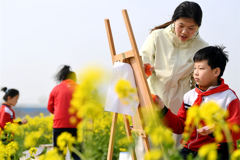 3月27日,广平县第一实验小学学生在油菜花田绘画。