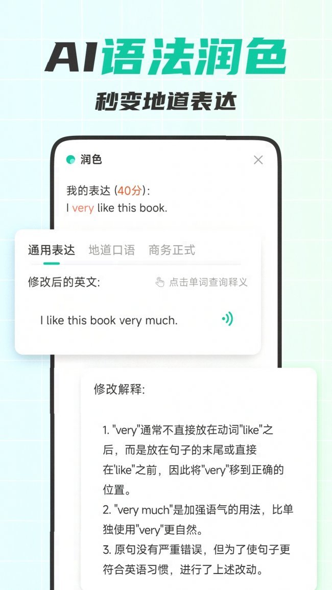 做到了单词、句型、对话三位一体训练,不仅练口语,还能同步提升听力、词汇和语法应用能力,语速可以根据孩子的水平灵活调节,还有中英双语提示,零基础的孩子也能轻松上手。备考KET、PET的孩子还可以用里面的真题口语训练功能,AI会给出专业评分和回答润色建议,对接考试需求。