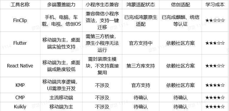 在数字化转型浪潮中,企业移动应用开发面临“开发效率低、跨平台难、合规要求高”三重挑战。传统原生开发模式下,iOS、Android、鸿蒙等多端重复开发导致人力成本激增;而单纯依赖H5混合开发又难以满足金融、政务等场景对性能与安全性的严苛要求。本文将从平台架构师视角,选取FinClip、Flutter、React Native、KMP、CMP、Kuikly六款主流工具,聚焦跨平台覆盖范围、小程序生态兼容性、信创与鸿蒙适配能力三大核心维度,为不同业务场景的选型提供参考。
