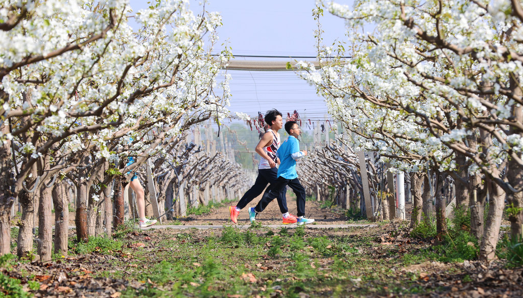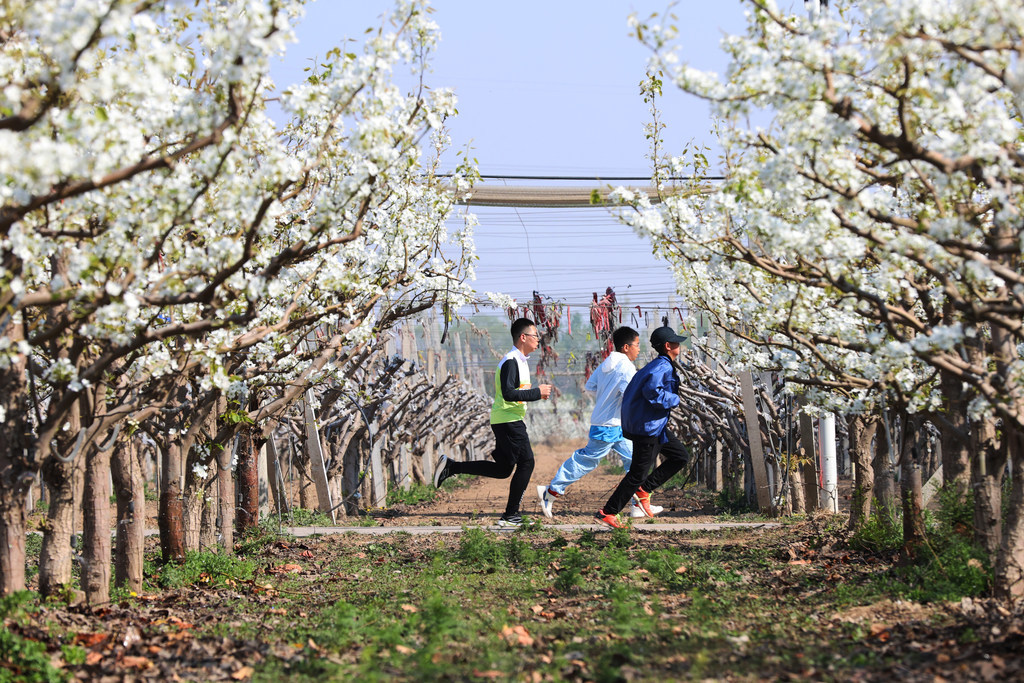 4月4日,市民在威县梨园参加“迷你跑”活动。