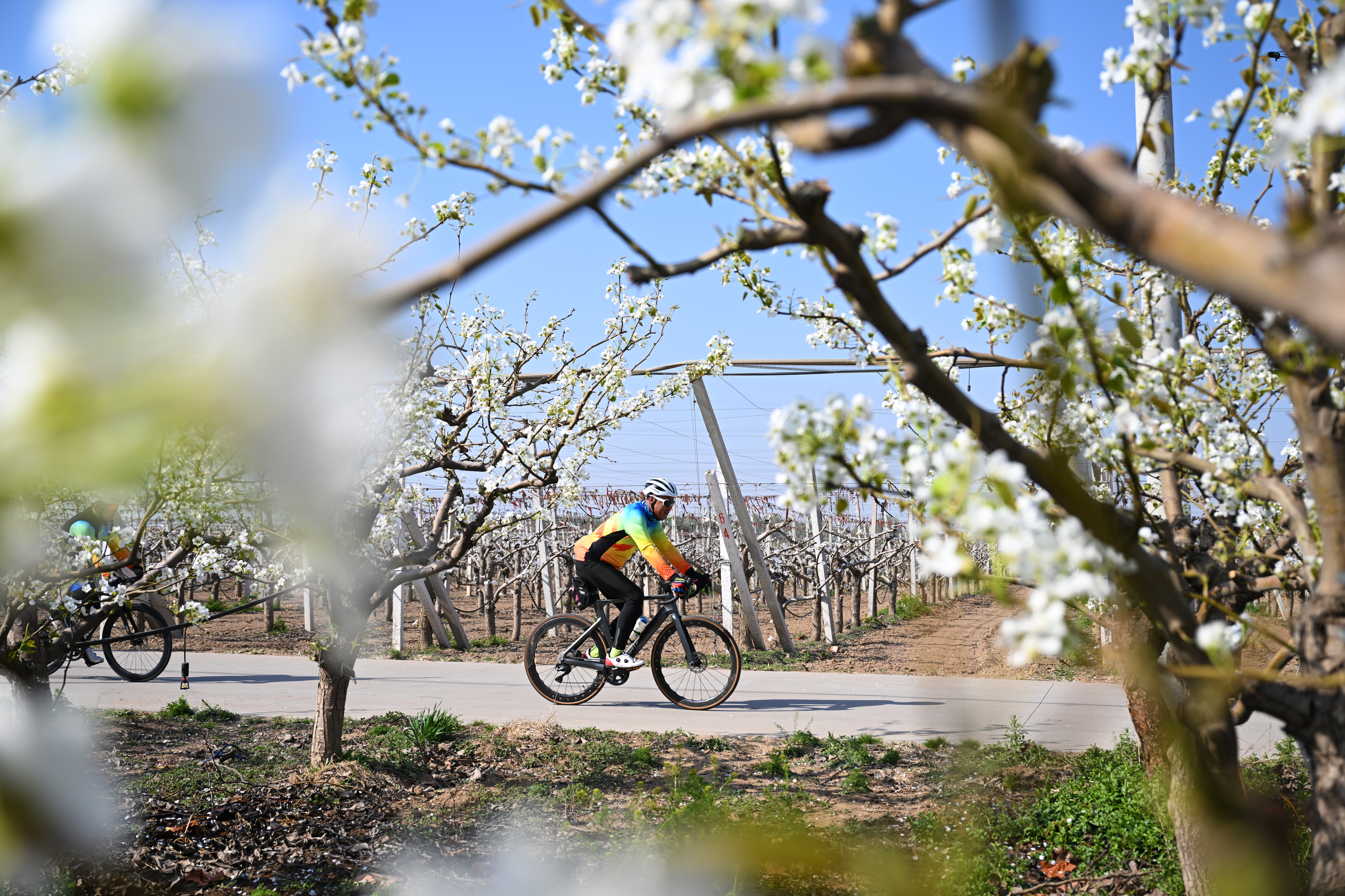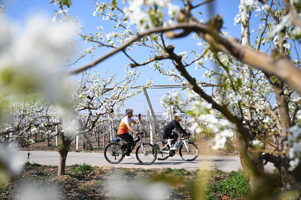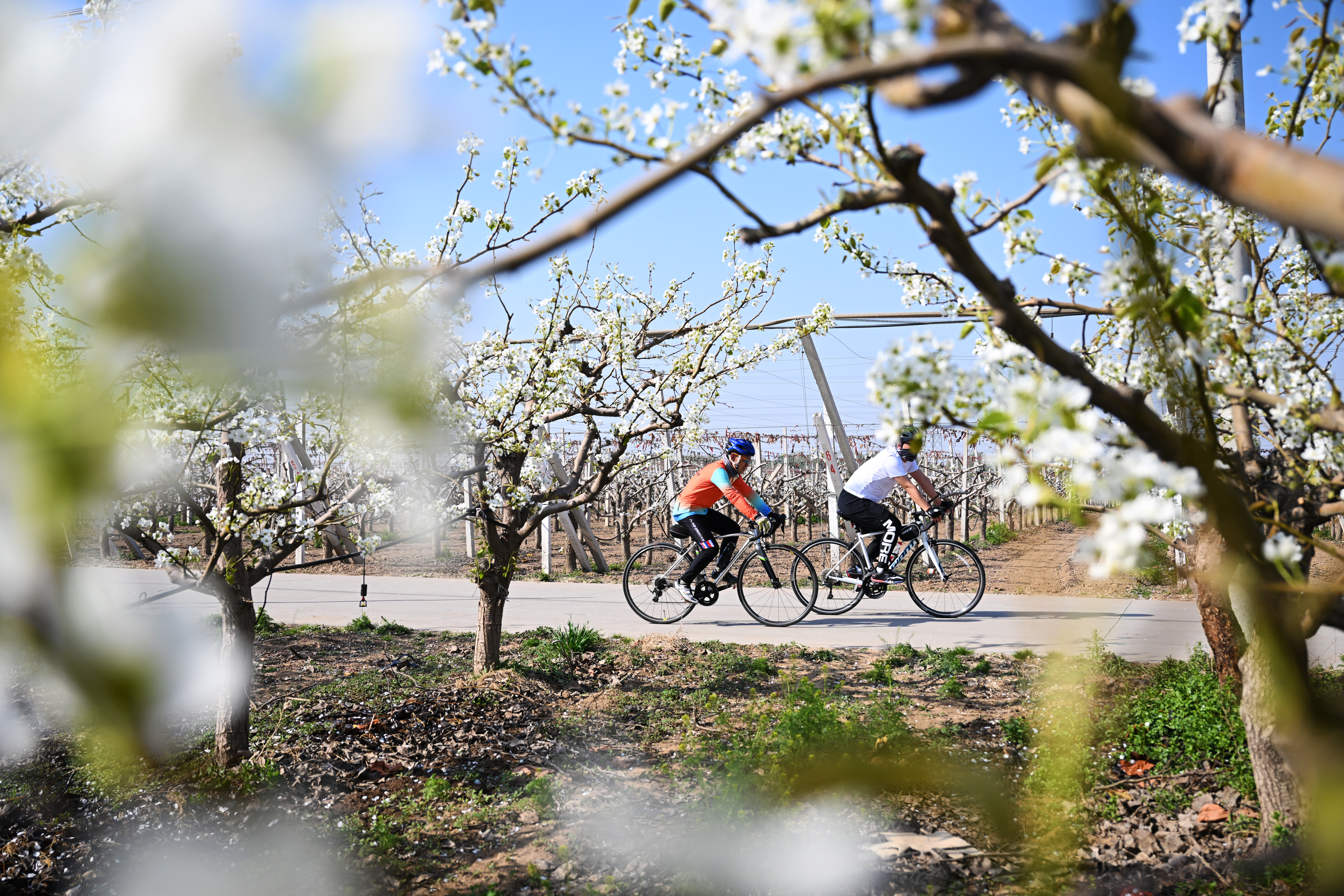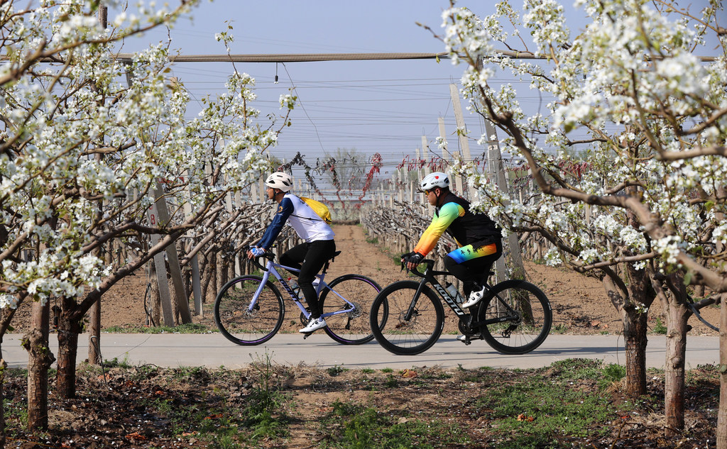 4月4日,自行车爱好者在威县梨园骑行赏景。