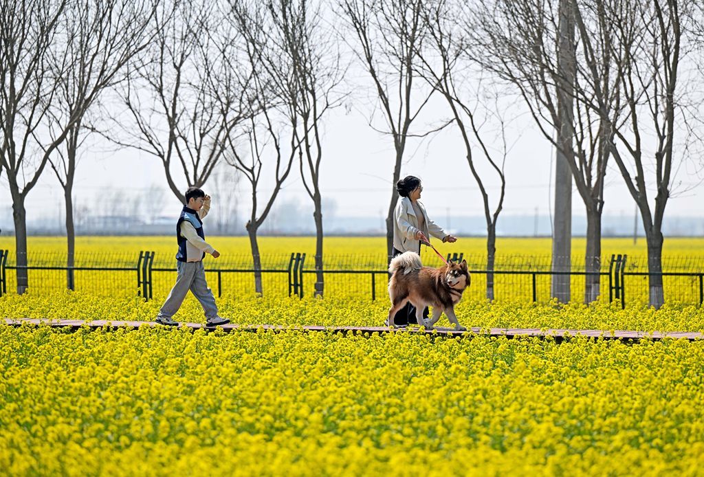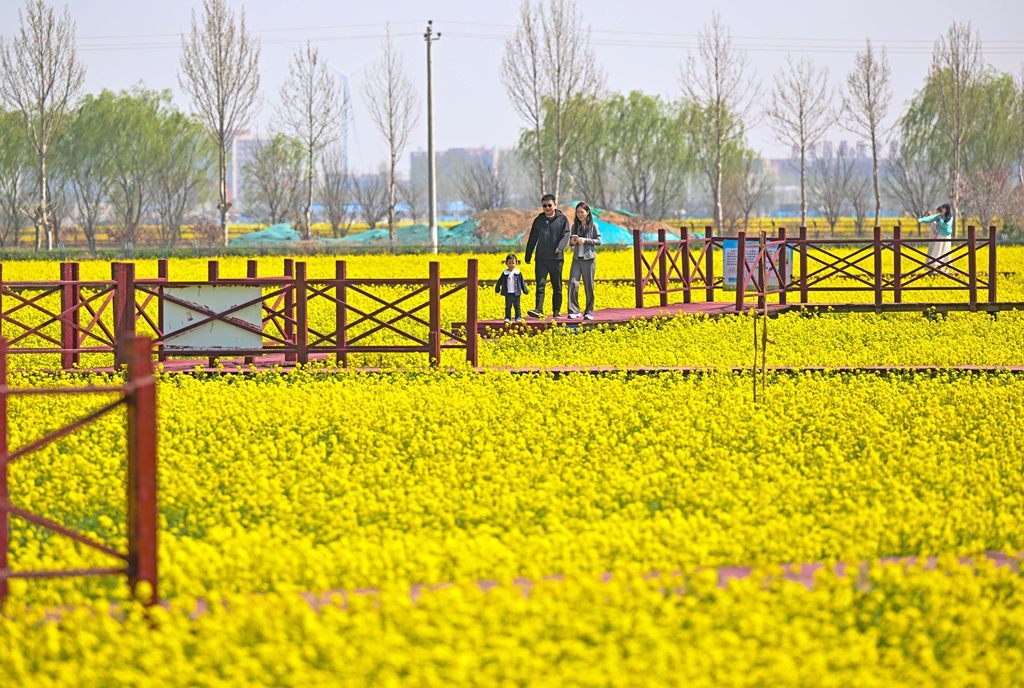 4月4日,游人在安平县杨屯村万亩油菜花海赏花踏青。